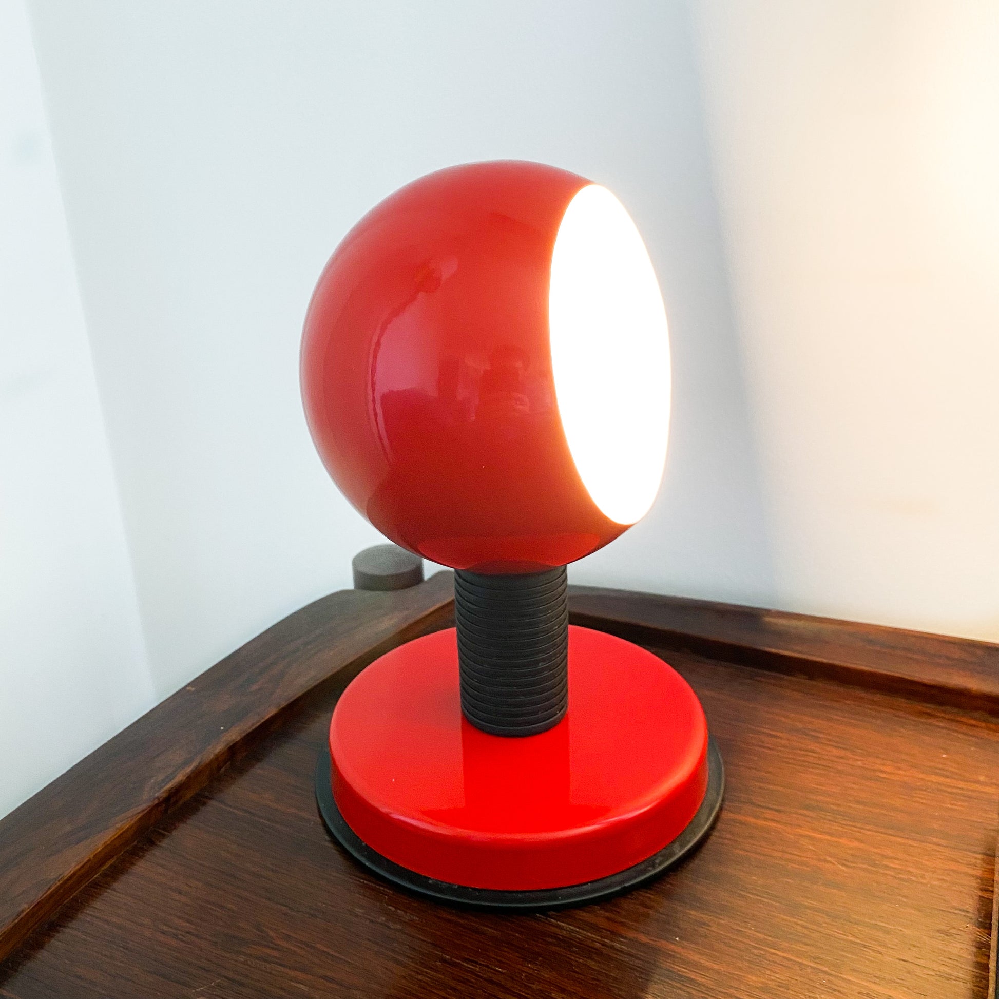 Lampe Eyeball rouge fabriquée en Italie par Veneta Lumi. Sa forme géométrique et sa couleur vive nous transporte tout droit dans les années 80 !