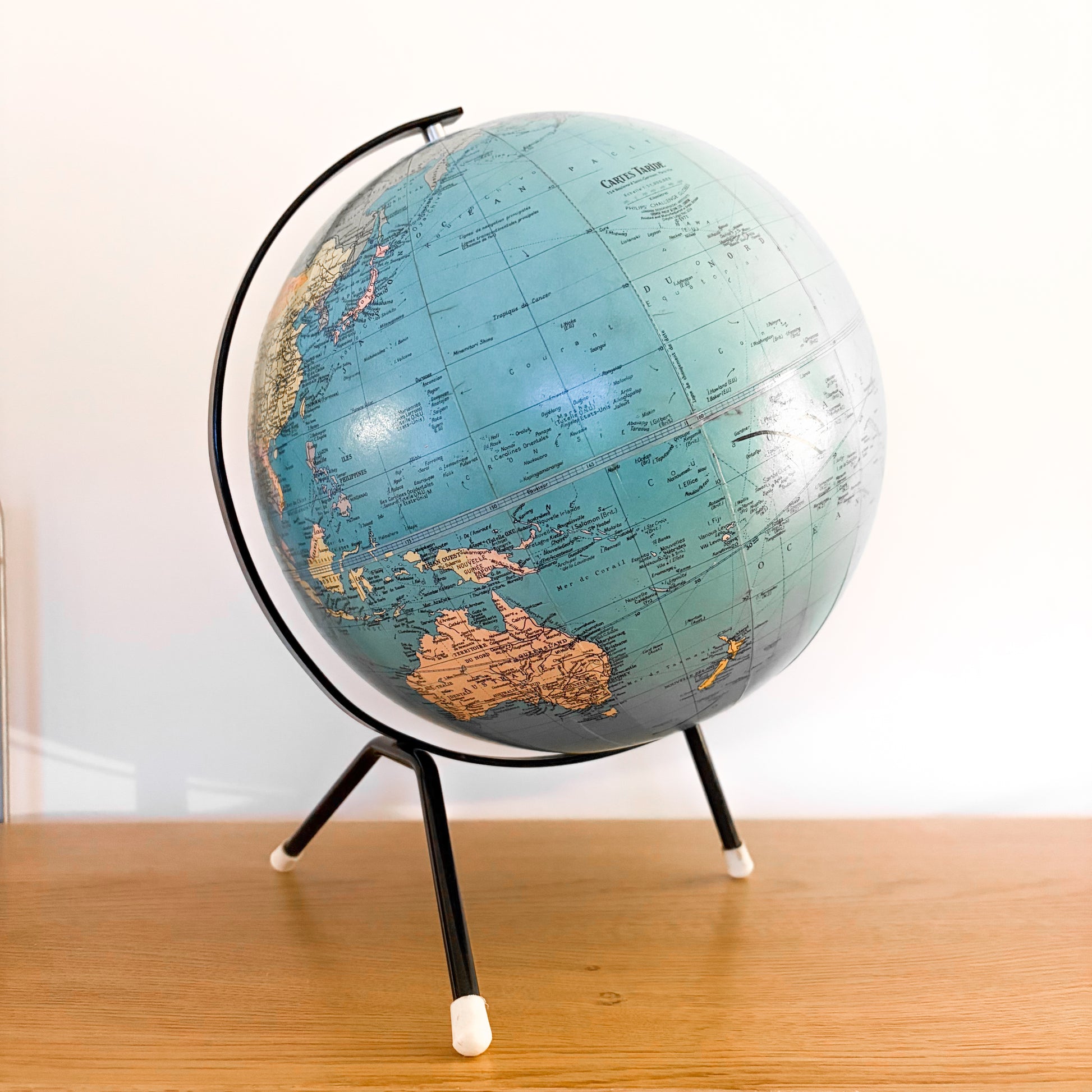 globe cartographique vintage édité en 1971 par les Cartes Taride. Globe monté sur un pied tripode noir.