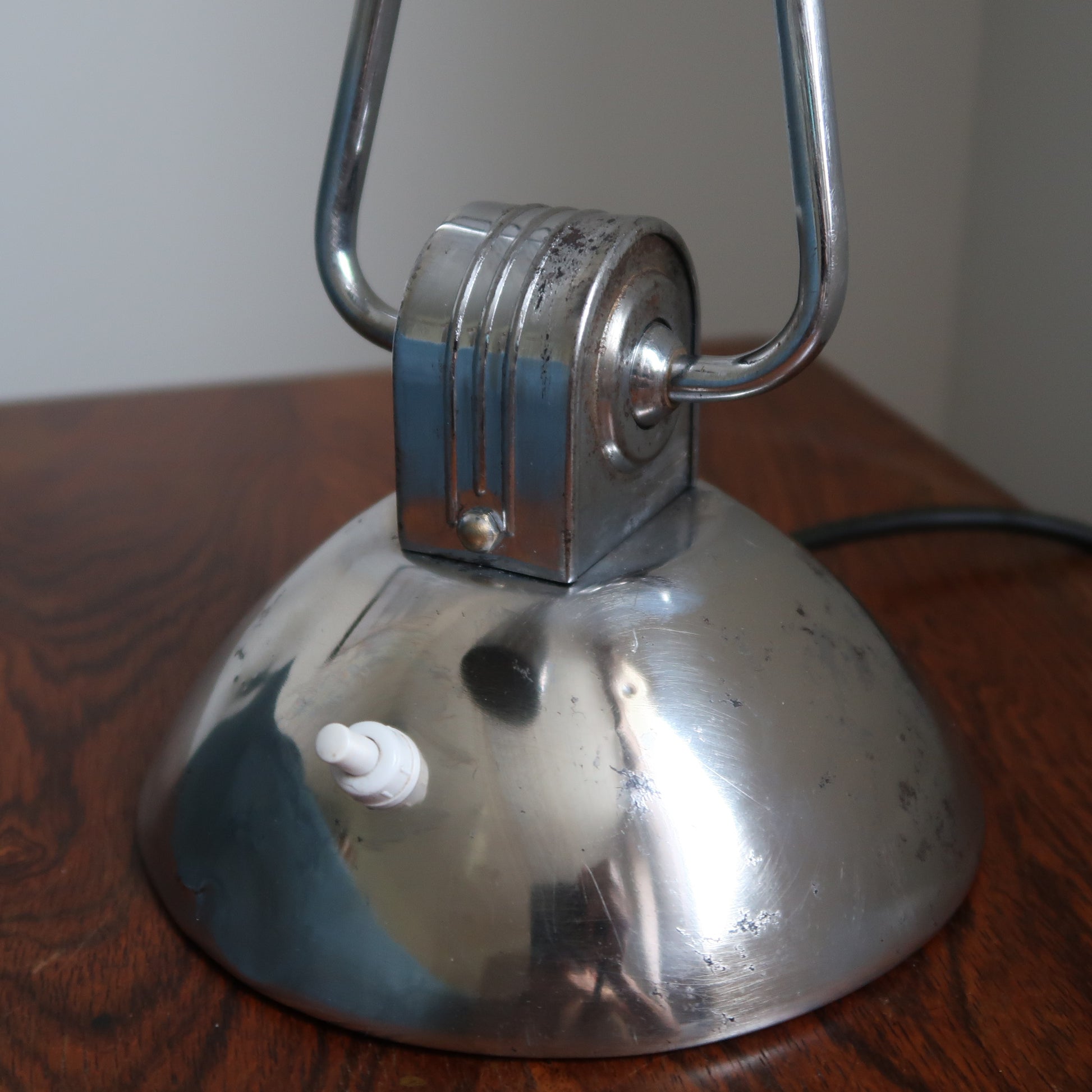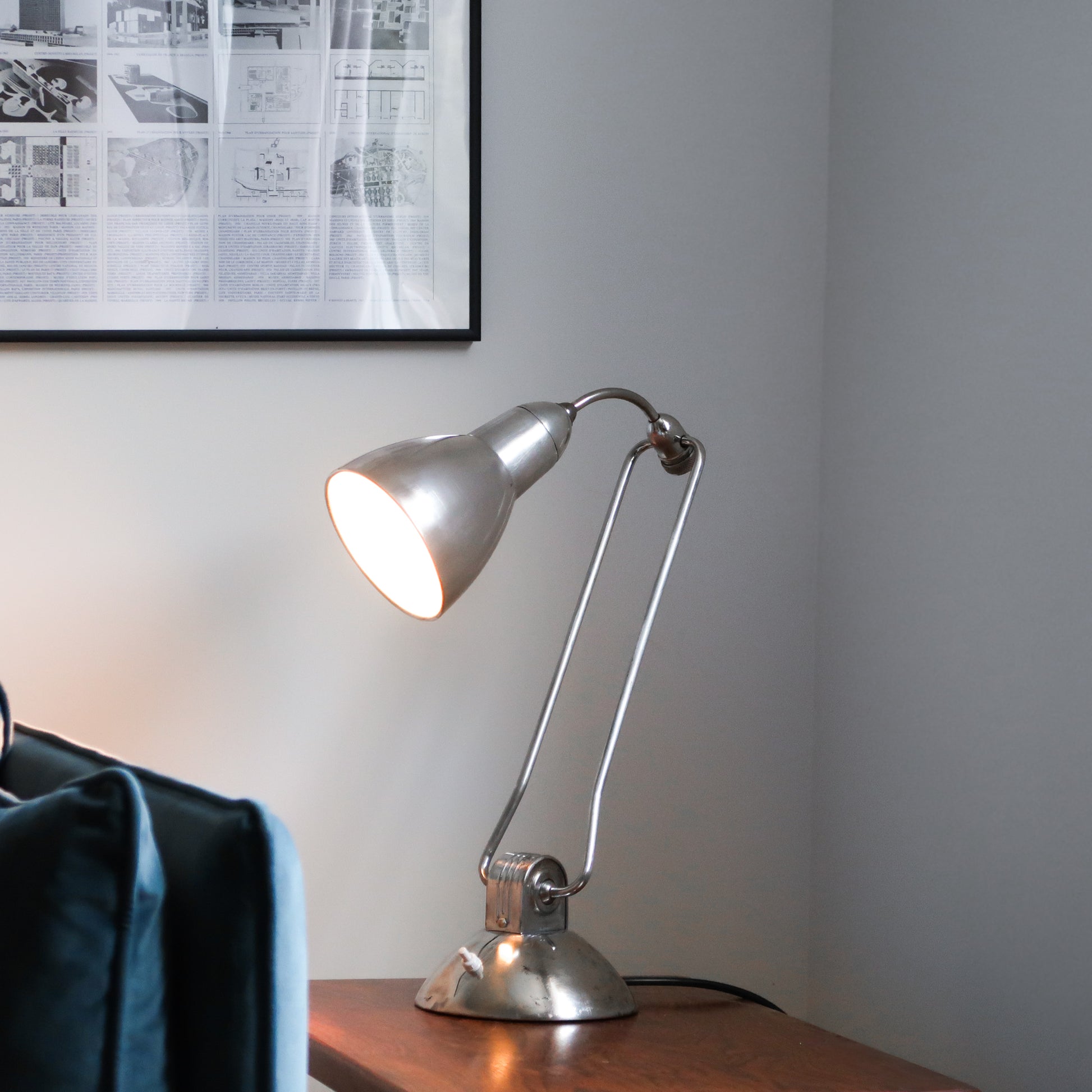 Élégante lampe de style art déco fabriquée dans les années 50 par la marque française Jumo. Cette belle lampe vintacte Jumo 610 offre une grande modularité grâce à sa tête en col de cygne et son bras inclinable.